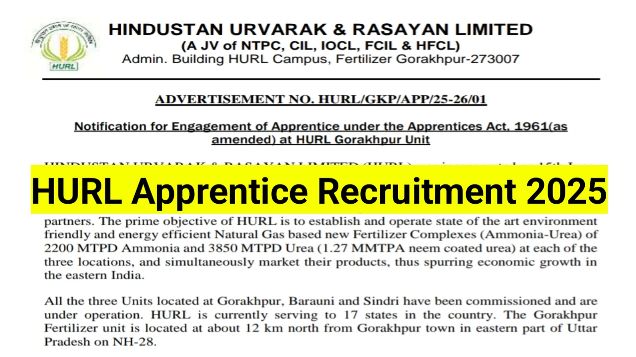 HURL Apprentice Recruitment 2025: The Hindustan Urvarak & Rasayan Limited (HURL) has announced an official notification (Advt. No. HURL/GKP/APP/25-26/01) for the recruitment of Apprentices. There are 53 vacancies available for these posts. Candidates with Diploma/Graduate qualification are eligible to apply online. Eligible candidates can apply online on or before 30th September 2025. The detailed eligibility criteria, stipend and application fee for HURL Apprentice Jobs are explained below.